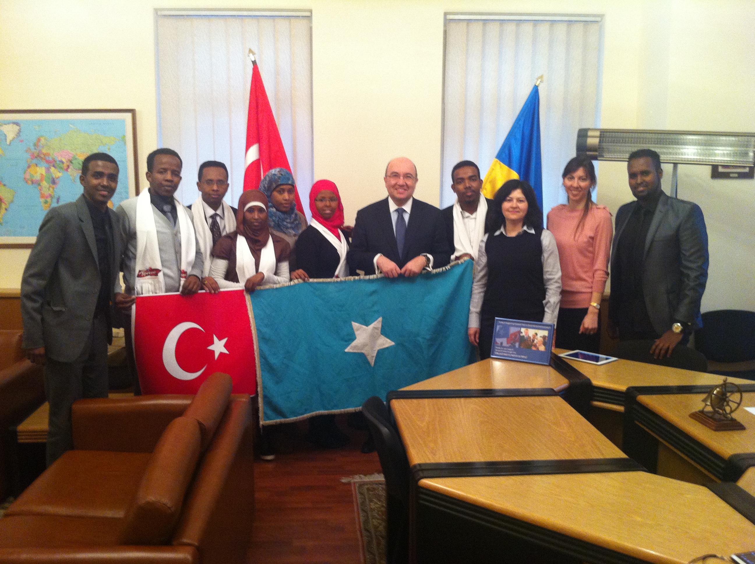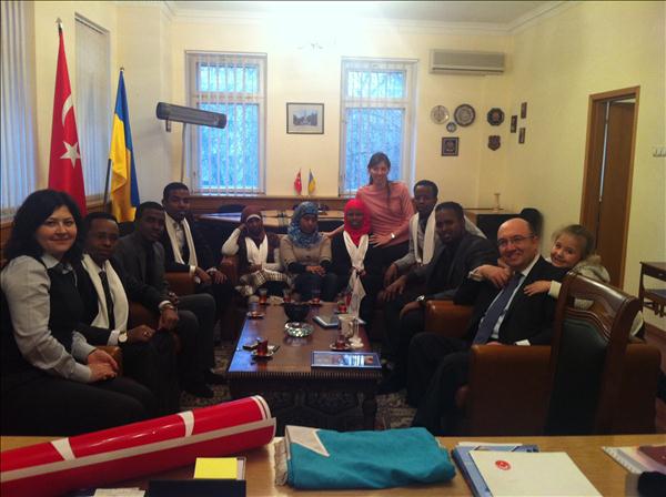 Ukrayna’nın Chernivtsi şehrinde tıp okuyan Somalili öğrencilerin kurduğu Ukrayna Somalili Öğrenciler Derneği’nin başkanı Hussein Mohamoud Büyükelçiliğimize ulaşarak ülkemizin Somali’ye yaptığı yardımlardan dolayı şükranlarını sunmak üzere bir grup Somalili öğrenciyle birlikte ziyaretimize gelmek istediklerini belirtmiş ve Kiev’e 400 km uzaklıktaki Chernivtsi şehrinden kiraladıkları otobüsle 9 saatlik bir yolculuğun ardından sekiz Somalili öğrenci 14 Aralık Çarşamba günü Büyükelçiliğimizi ziyaret etmiştir.