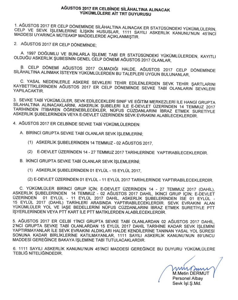 Ağustos 2017 Er Celbinde Silahaltına Alınacak Yükümlülere Ait TRT Duyurusu