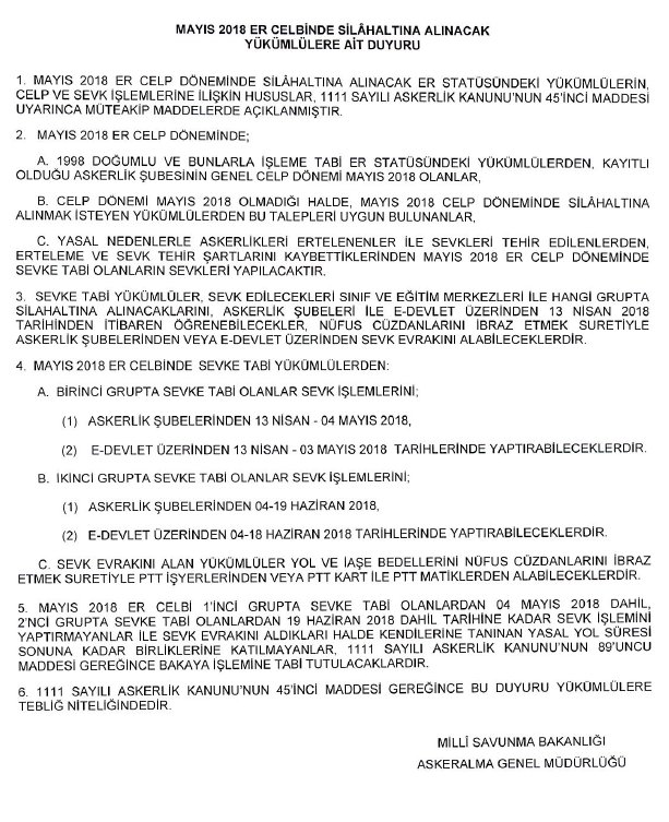 Mayıs 2018 er celp döneminde silah altına alınacak er statüsündeki yükümlülerin, celp ve sevk faaliyetlerine ait tebliğ yerine geçecek duyuru, 1111 sayılı Kanunun 45. maddesi gereğince Milli Savunma Bakanlığından alınmakla ekte sunulmuştur.