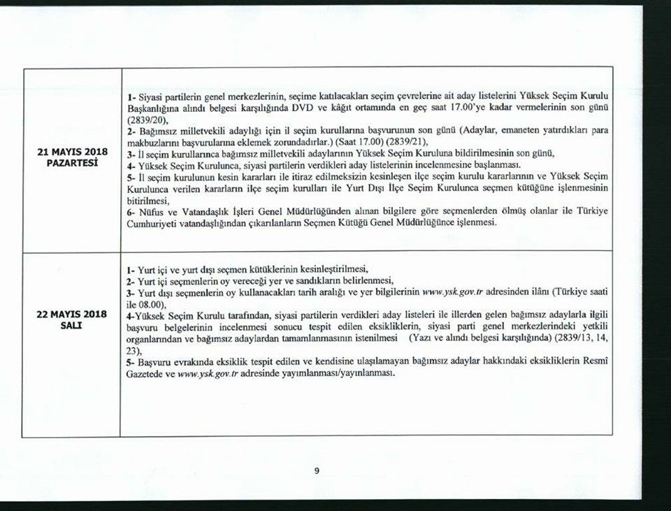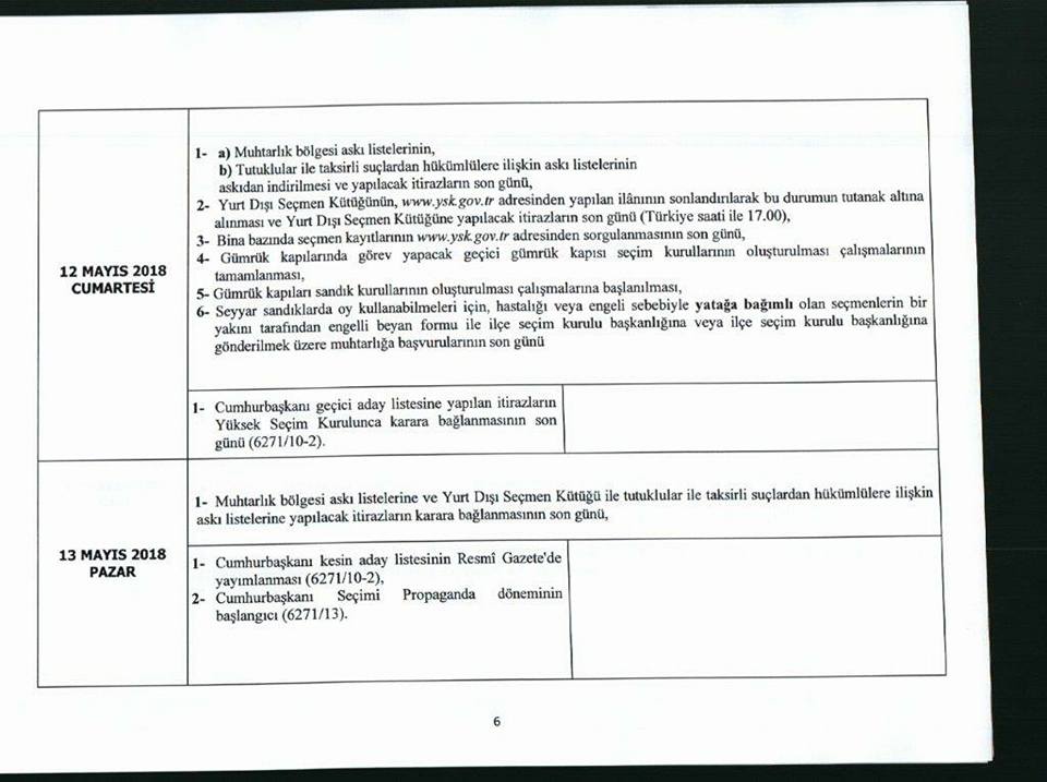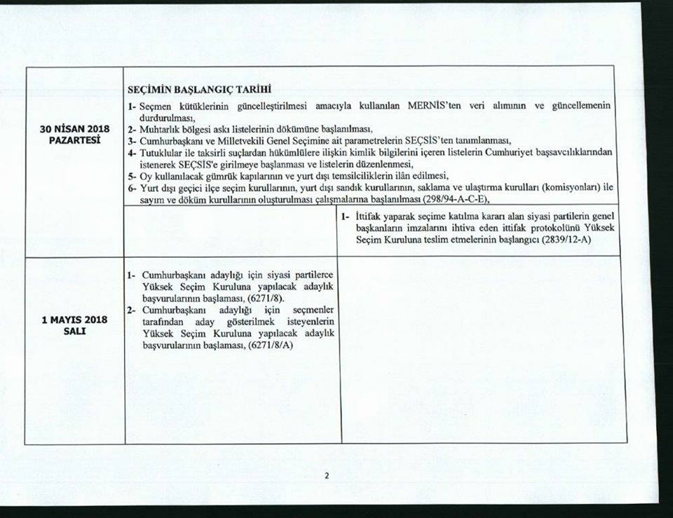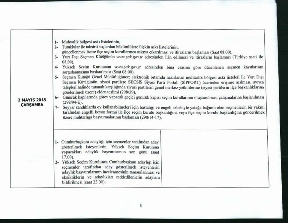 Seçim takviminde, yurtdışında oy verecek seçmenleri ilgilendiren bölümler ise ayrıca ekte sunulmaktadır.
