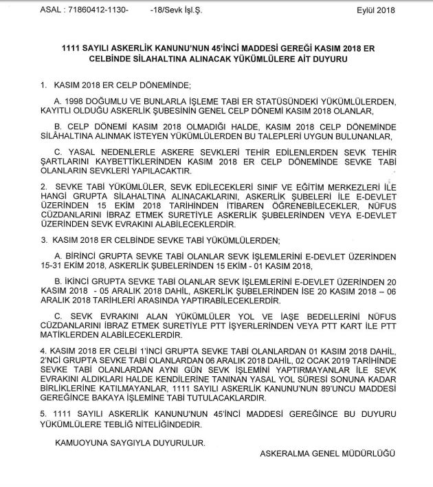 Milli Savunma Bakanlığı Askeralma Genel Müdürlüğü'nün 2018 Kasım Er Celbi Duyurusu: