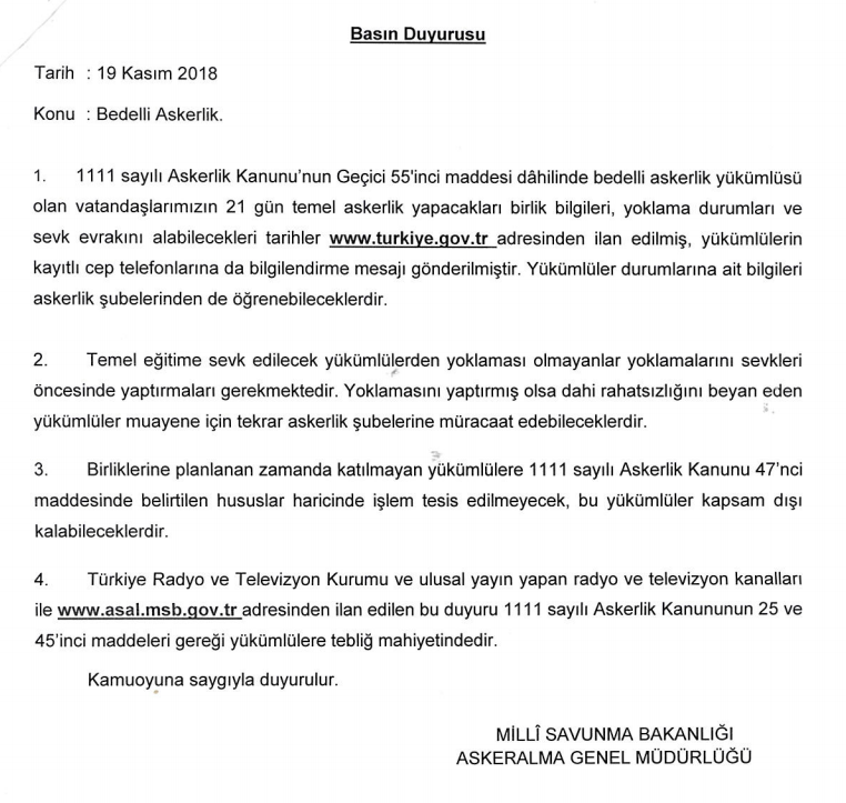 Milli Savunma Bakanlığı'nın 19 Kasım 2018 tarihli ve Bedelli Askerlik konulu duyurusu ilişikte sunulmaktadır.