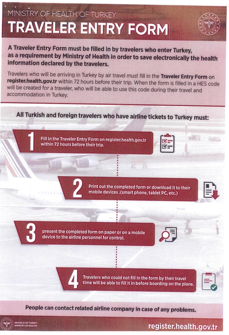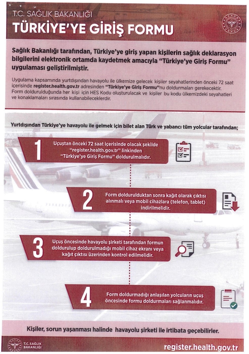 Sağlık Bakanlığı'ndan alınan bilgiye göre, 15 Mart 2021 tarihindenitibaren Türkiye'ye hava yoluyla giriş yapacak 6 yaş ve üstü yolcuların, uçağın kalkışından önceki son yetmiş iki (72) saat içerisinde "http://register.health.gov.tr" adresinden "Türkiye'ye Giriş Formu"nu elektronik ortamda doldurmaları gerekmektedir.